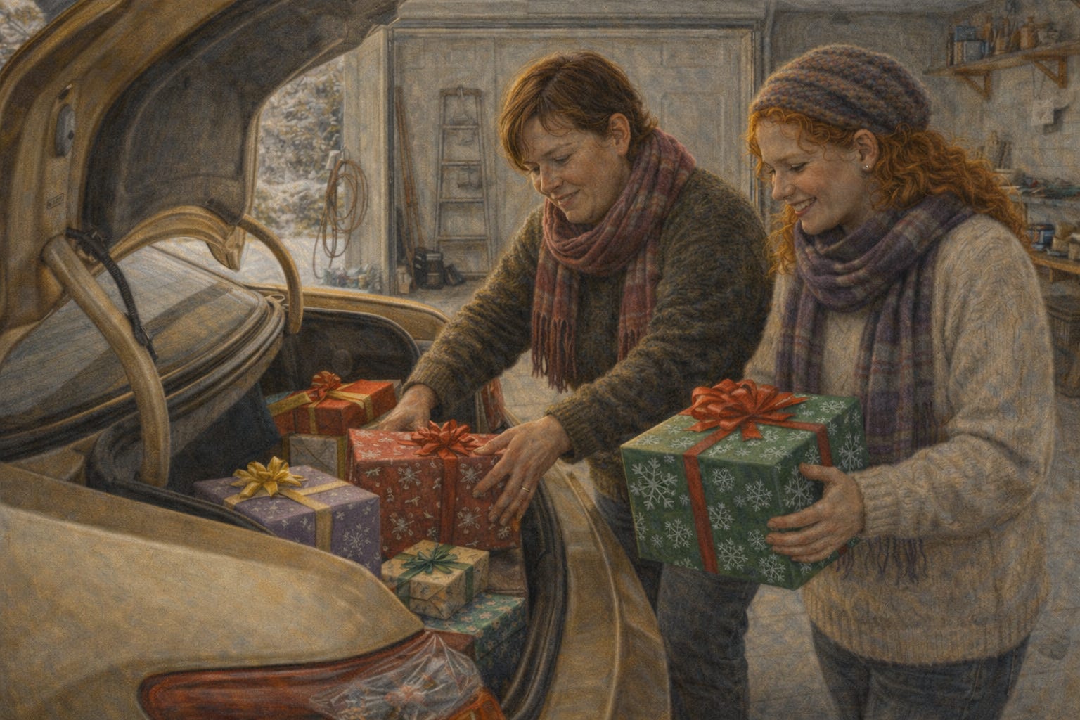 “Hey River, can you help me load the car with the presents and food, please?” Mom called from the garage door.